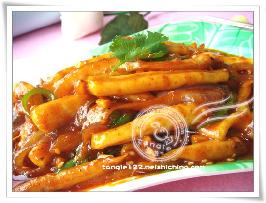 PS:因为鱿鱼是抄过水的,其他材料都很好熟,因此不用炒太长时间。油要稍多一些。可以根据个人口味加入适量糖和大蒜。鱿鱼也可以切成圆圈形,或者切片打花刀,成品都很漂亮。