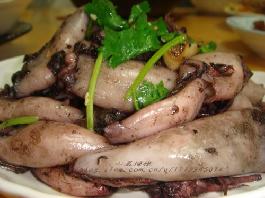 1.鱿鱼仔在开水中稍烫一下,倒掉锅中水.倒少许油,放入鱿鱼仔,加盐,味精快速翻炒,盖上锅盖。