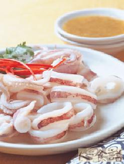 3.等水滚后,加入作法1的鱿鱼段,以大火煮约半分钟后捞起装盘,食用时以果泥沾酱沾食。