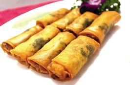 5.武火烧锅下油,烧至七成热时放入蛋卷,用文火炸至金黄色即成。