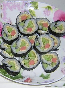 2。准备好竹帘就可以开工了,放上紫菜,把糯米饭铺在紫菜上并压平,不过不要太用力,不然紫菜会被压爆的,然后涂一层沙拉酱,把火腿、黄瓜、蛋摆上去就行了