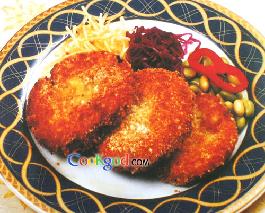 将南瓜熟制后用刀具制成泥,加入盐、胡椒粉、糖、鸡蛋搅拌均匀,再将南瓜泥搅匀后制成饼状。将南瓜饼蘸上面粉,拖蛋液蘸面包渣后煎至金黄色后即可装盘,盘边配炸好的土豆丝、渍紫菜丝煮青菜等配菜。