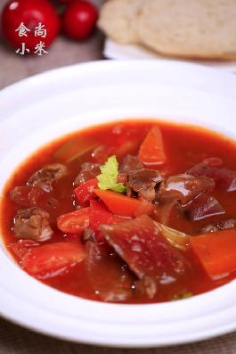 6、加入紫菜头、胡萝卜块加入牛肉汤略煮。