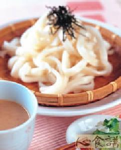 3.将作法2的面盛入容器中,放上海苔丝,另外用一器皿盛装作法1的沾酱汁;食用时,将乌龙面沾取酱汁享用即可。