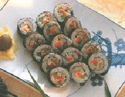 3. 海苔皮放于竹帘上,铺上一半的饭摊平,中间放入材料2后,用力将竹帘卷紧。