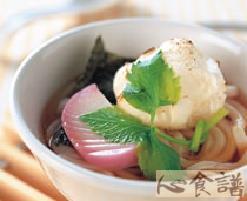 乌龙面1人份,海苔片1片,日式麻糬1个,三角形海苔1片,鱼板1片,鸭儿芹1支,七味粉适量,盐300㏄,味醂20㏄,酱油10㏄