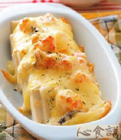 4.将作法1的竹笋片、豆腐片交错排入烤盘中,再加入作法2的材料,并淋上作法3的酱汁,最后撒上剩余的10公克乳酪丝。