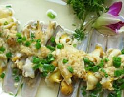 3.将蛏子放盘中,抹均蒜茸,入笼蒸八分钟,撒葱姜丝,浇热油,盘底浇白灼汁即成。