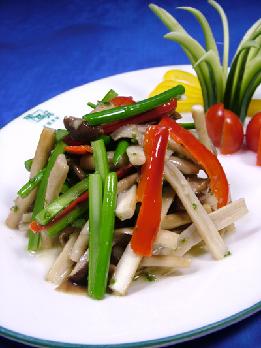 流程:将茶树菇改节,豇豆改节入沸水中氽断生使用。蒜和青尖椒剁粒,另用盘装入氽水后的茶树菇、豇豆、吃味拌制均匀装盘即。
