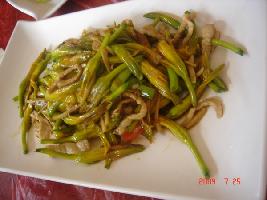 材料:新鲜金针半斤,猪瘦肉4两,姜丝1大匙,辣椒丝1大匙,太****1小匙