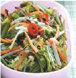 4.于大碗中加入所有调味料拌匀,加入作法2龙鬚菜段、金针菇段、红萝卜丝和黑木耳丝拌匀即可。