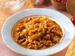 主料:熟面筋200克。水发冬菇片20克,水发玉兰片20克,口蘑50克,花生油150克,精盐5克,葱10克,姜15克,酱油10克,绍酒15克,猪油200克。