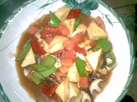 豆腐切三角行,青椒红椒切三角行,蘑菇切小块,西红柿切小块,蒜米切片,葱切段,先将锅烧热加油,在油热120度热就放豆腐下去炸2分钟,捞起。蘑菇和青椒红椒需要的是飞水,待用。锅洗干净,烧热加油20克,下蒜,炒香,加豆腐和蘑菇青椒红椒,开始炒加入一点高汤半勺,加西红柿。调味,盐6克,鸡精5克,味精2克,蚝油3克,老抽1克,酱油2克,糖1克,胡椒1克,香油3滴,待汤汁浓郁,加葱勾薄芡即可出锅。