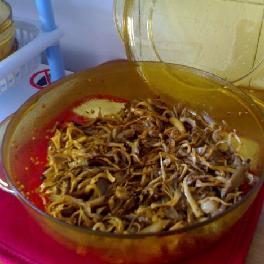 鲜蘑先撕成条壮入微波炉加热后再冲洗