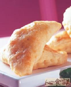 9.把作法8的派皮用圆模压出一片片圆形派皮,放上作法4的饺馅,圆边刷上水,再对折压紧即可。取一小钢盆,将涂酱材料拌匀成蜂蜜酱汁,涂在作法9表面上,用牙签在饺皮上面戳孔,再放入烤箱中层,以210℃烘烤10~15分钟即可。