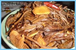 3.锅内放油,稍煸肉片和姜片、干辣椒,待肉片发白时,下茶树菇翻炒至均匀,加入盐、老抽、和上面滤出的泡菇水,大火烧开后,转小火,盖盖焖至水基本收干时起锅即可。