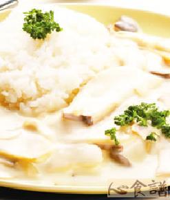 4.于作法3锅内慢慢倒入高汤、牛奶及鲜奶油一起搅拌、煮开,再加入作法2的鲍鱼菇片一起炒匀,最后放入盐、糖搅拌调味后起锅淋在白饭上即可。