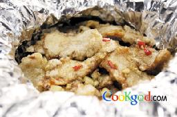 将百灵菇加入些许蚝油后,加入胡椒、鸡粉入锅清煎小会;出锅后放入少许花酒,再入屉蒸熟;取出来切成片状并抹上生粉,最后用食用油炸至金黄色即可。