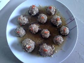 鲜冬菇12朵 猪绞肉 掌心般大小(微剁碎) 洋葱碎半颗(大) 盐&胡椒粉&鱼露&麻油适量 水&太****些许 蚝油少许 辣椒碎1条