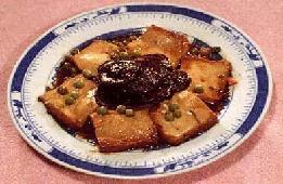 锅留底油,下香菇、青豆煸炒、加料酒、味精、盐﹑鲜汤,入味后勾芡淋少许香油,放到豆腐中央即成。