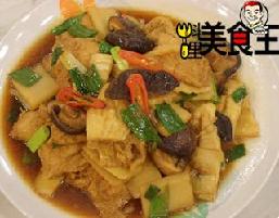 材料:豆包6片,冬菇6朵,笋半根,红辣椒1根,青葱3根,高汤1小碗
