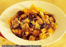 烤麸100g,腐竹100g,豆腐皮100g,黑木耳50g,香茹100g,花生米100g,玉兰片100g,盐1汤匙(15g),糖4茶匙(20g),鸡精2茶匙(10g),酱油1汤匙(15ml),葱3片,姜3片,大料2个,香油1汤匙(15ml),油50ml,水1碗(250ml)