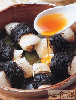 竹笙2条,干髮菜5公克,金菇10公克,丝瓜10公克,香菇2小条,素食高汤20公克,水30公克,糖10公克,盐3公克,太****少许