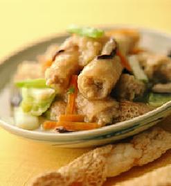 4.)调味料(2)加热至黏稠状淋于作法(3)上拌均即可食用。