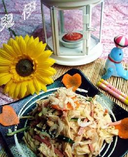 腐竹,黄瓜,胡萝卜,虾皮,麻油,火腿,生抽,盐,鸡精,糖