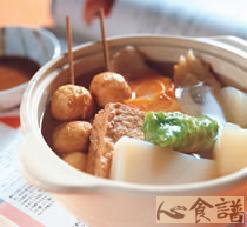 鱼丸6个,油豆腐6块,竹轮1/2条,高丽菜叶6片,红萝卜1/2条,白萝卜1/2条,蒟蒻1/2块,柴鱼高汤2750cc,竹签6根,猪绞肉150公克,鱼浆30公克,蛋1/4个,葱泥5公克,玉米粉1茶匙,猪油50公克,香油1茶匙,白酱油1茶匙,盐1/4茶匙,水5cc,黑轮沾酱适量