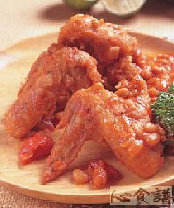 1.鸡翅洗净,放入大碗中,加入盐及低筋面粉拌匀,放入约180℃的热油中,以中火炸至表面金黄,捞出沥干油分备用。