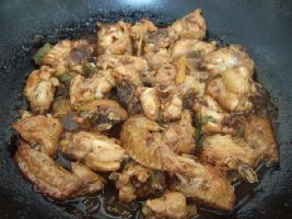 3.锅洗净后加少许油后放入姜丝、辣椒爆香,后再放入鸡翅翻炒片刻,待入味后,加入生抽酱油,再放少许老抽调色,加水盖过鸡翅焖至收汁,再加少许盐调味即可。
