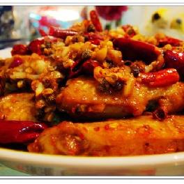 锅烧热放入花椒和干辣椒炒香倒出,再往锅内倒少许油,把腌渍好的鸡翅放入煎至表面金黄盛出。这里要注意的事只要放一点点油就可以了,因为鸡翅表面煎过之后也会出油,油多了就会比较油腻。