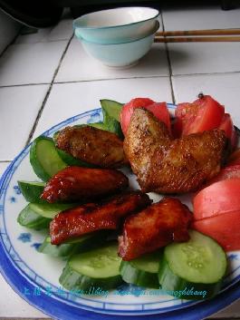 1.鸡翅6个,洗净,擦干水分,用牙签在鸡翅上戳几个孔,便于腌制时入味。
