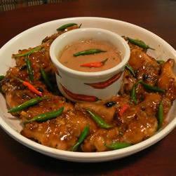 鸡翅1360克,鸡汤235毫升,白糖200克,鱼露60毫升,苹果醋30毫升,生粉8克,红椒粉5克,植物油15毫升,蒜末45克,墨西哥辣椒15克,捣碎,红椒25克