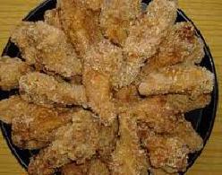 10.炒锅置旺火上,放入熟猪油,烧至六成热时端离火口,将鸡翅逐个下锅,待全部下完后,把锅端回火上,炸至浅黄色,捞出装盘,撒上花椒盐即成。