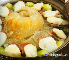 (3)菜心12棵,火腿用开水烫一虾,金钩翅加姜汁50g焯水;沙锅中依次排菜心,火腿片和鸡浮,金钩翅放中间;上汤1500g烧开,加料酒25g倒入沙锅中煲开,用小火煲80分钟,加盐、味精、鸡粉调味即上桌。