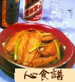 主料:鸡翅膀24只(约重750克),猪排500丸。配料:水发香菇50克,鲜冬笋50克,京葱50克。,调料:姜块(拍碎)10克,绍酒50克,红葡萄酒50克,酱油30克,白糖10克,鸡清汤1000克,熟猪油500克(约耗60克)。