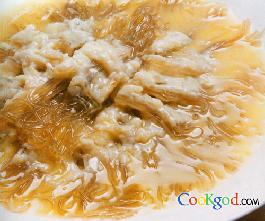 用料主料:山芋粉丝250g。配料:山药250g,糯米粉50g,大米粉50g,蛋清1个。调料:鸡汤500g,姜汁1 5g,精盐4g,味精2g,鸡粉2g,稳定生粉30g,胡椒粉1/3g,色拉油25g,鸡油10g。