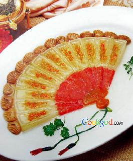 用料主料:煨制好的鱼翅150克、蟹黄50克、冬瓜1000克配料:口蘑20个、蟹柳50克、蛋皮50克调料:鸡油100克、盐10克、味精5克、鸡汤400克、湿淀粉10克