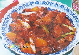 2、鸡块下入烧至七成热的油中炸至外皮脆硬捞出,待油温升至八成热时,下入冬笋块略炸,再下入京葱段炸呈金黄色,倒入漏勺。锅内放猪油40克烧热,下入姜片爆香,下入番茄酱略炒,烹入料酒,加入鲜汤、酱油、精盐、白糖,下入鸡块大火烧开,改用小火炖至熟烂,下入粉条炖熟。将鸡块、粉条捞出,装入盘内。