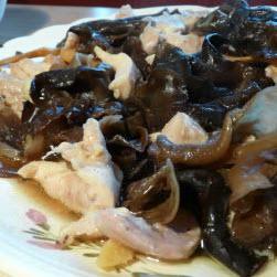 鸡肉450克,干香菇6个,云耳1把,姜5片,压汁,生抽1茶匙,盐1/8茶匙,白糖1/4茶匙,料酒2茶匙,白胡椒粉,蚝油1茶匙,葱1条,生粉2茶匙,菜油2茶匙