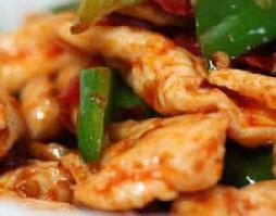 2.炒锅置火上,倒入香油烧热,投放辣椒丝煸炒一下,再放入葱丝和姜丝煸出香味后烹放料酒,加入酱油、味精、醋、胡椒粉和适量的凉开水调制成的酸辣汁,食用时浇在鸡片上拌匀即可。