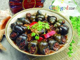 田螺500克,家养土鸡半只,肉末120克。调料盐10克,白糖20克,贺盛好师傅鸡粉20克,老抽25克,八角2个,葱末、姜末各15克,胡椒粉5克,香菜叶、红椒条各6克,生粉15克,色拉油30克,高汤700克,明油8克。