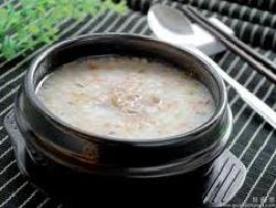 3、将粳米倒入锅内,加原汁鸡汤,用大火煮沸,再改用小火煮至粥稠,便成鸡肉粥。食用时将鸡粥盛入碗内,将鸡肉切片装盘,用葱、姜、精盐、酱油、香油调匀成佐料,蘸食