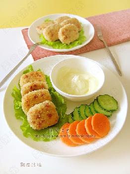 鸡块中多了火腿和蔬菜,蘸食甜味沙拉酱口味非常的好,也可以用鸡腿肉制作,只是用鸡腿肉就不适合剁成茸状了。