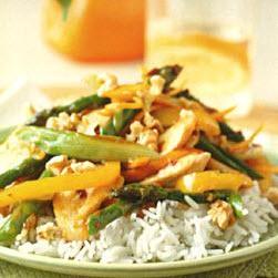 柳橙1个,米酒或不甜的雪莉酒2汤匙,酱油1汤匙,糖1茶匙,太****(粟粉)11/4茶匙,干辣椒片1/4茶匙,芦笋225克,去掉老茎后切段(5厘米长),蔬菜油1汤匙,无骨去皮鸡脯肉,切条(1.5厘米宽)450克,削皮的姜1汤匙末,大蒜1瓣,切末,红甜椒1个,去籽后切条,青葱4根,切段(5厘米长),核桃45克,切碎