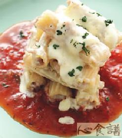煮熟水管面100公克,鸡肉泥50公克,高汤300cc,洋香菜末少许,A.洋葱末10公克,白酒10cc,盐1/4茶匙,B.奶油白酱100公克,红酱50公克
