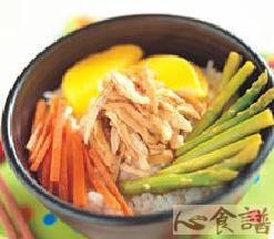 2.将鸡胸肉用手剥丝,舖在白饭上,淋上少许卤汁,配上黄萝卜片和香菜即为香喷喷的鸡肉饭。