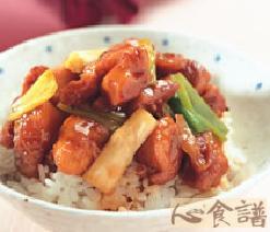 3.准备一人份的白饭,放入大碗中,再把作法2的材料淋在白饭上,即完成照烧鸡肉丼。